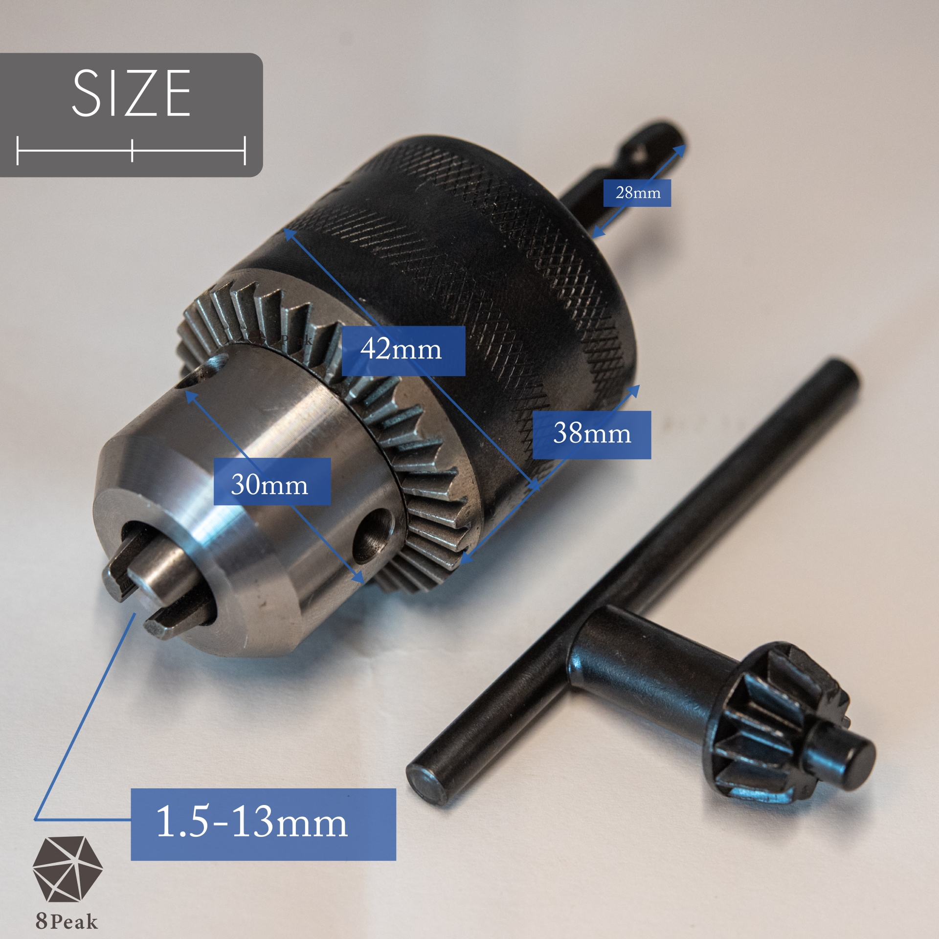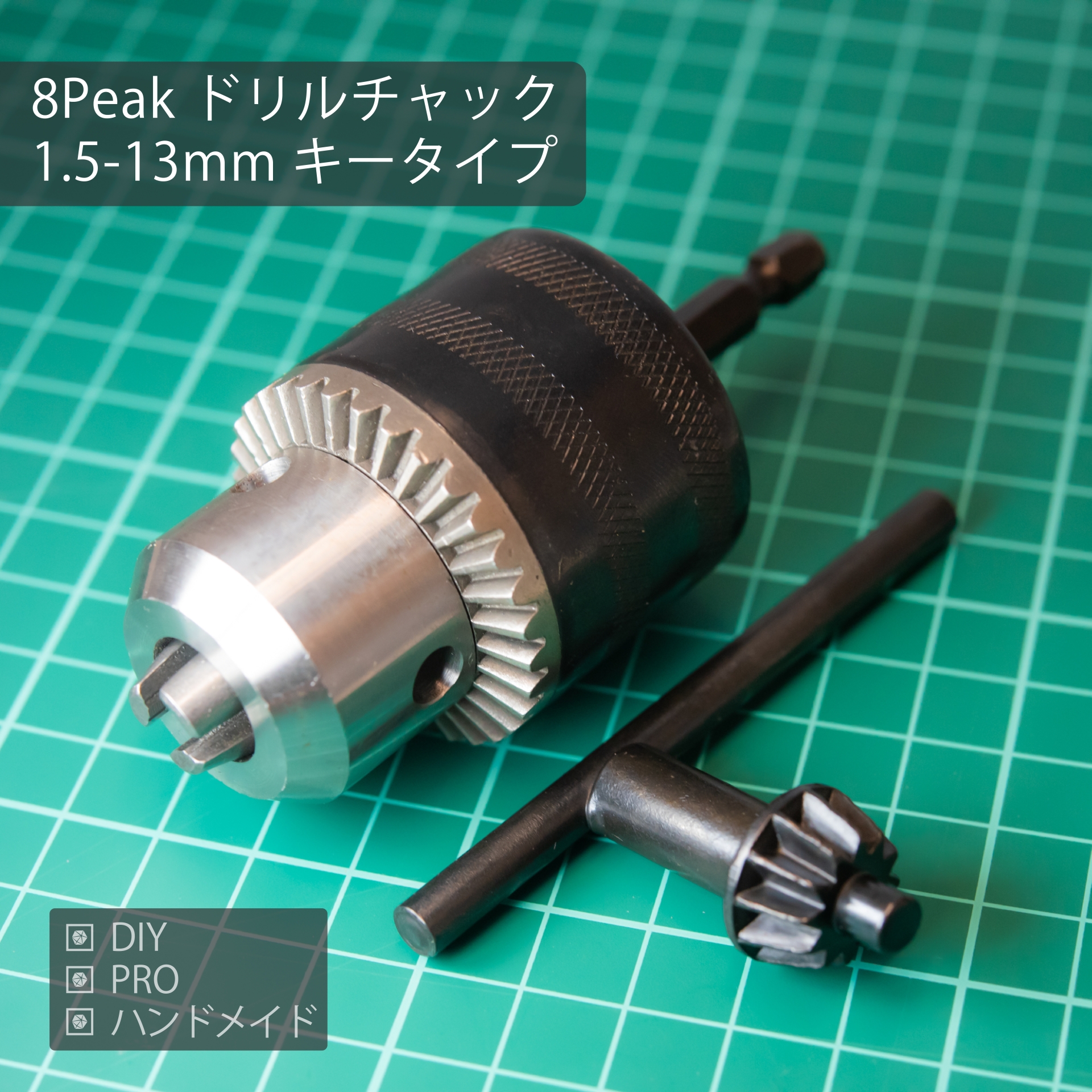 6角軸の電動ドリル等で1.5-13mmの幅広い丸軸の先端工具が使えるキー付きチャックアダプター